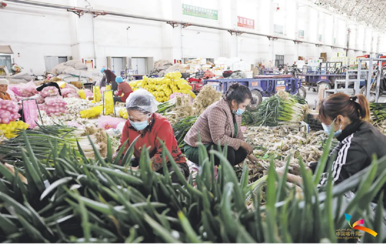 喀什疆南农副产品批发市场内,工作人员对大葱进行分拣包装。喀什地区融媒体 记者余思民 摄