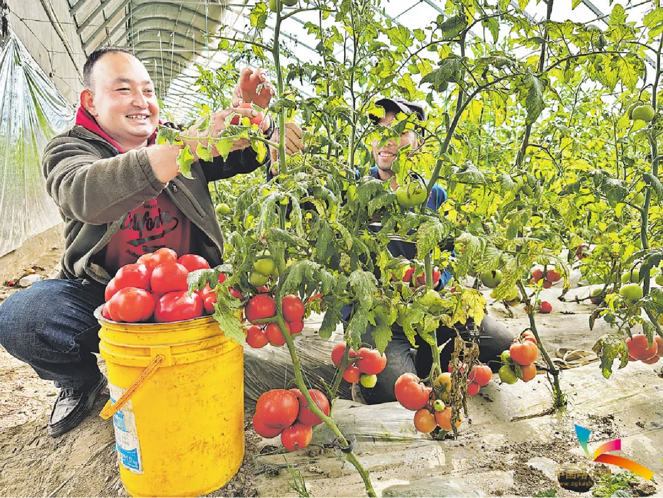 叶城县阿克塔什镇现代设施蔬菜农业基地大棚负责人正在采摘西红柿。喀什地区融媒体 记者张红玲 摄