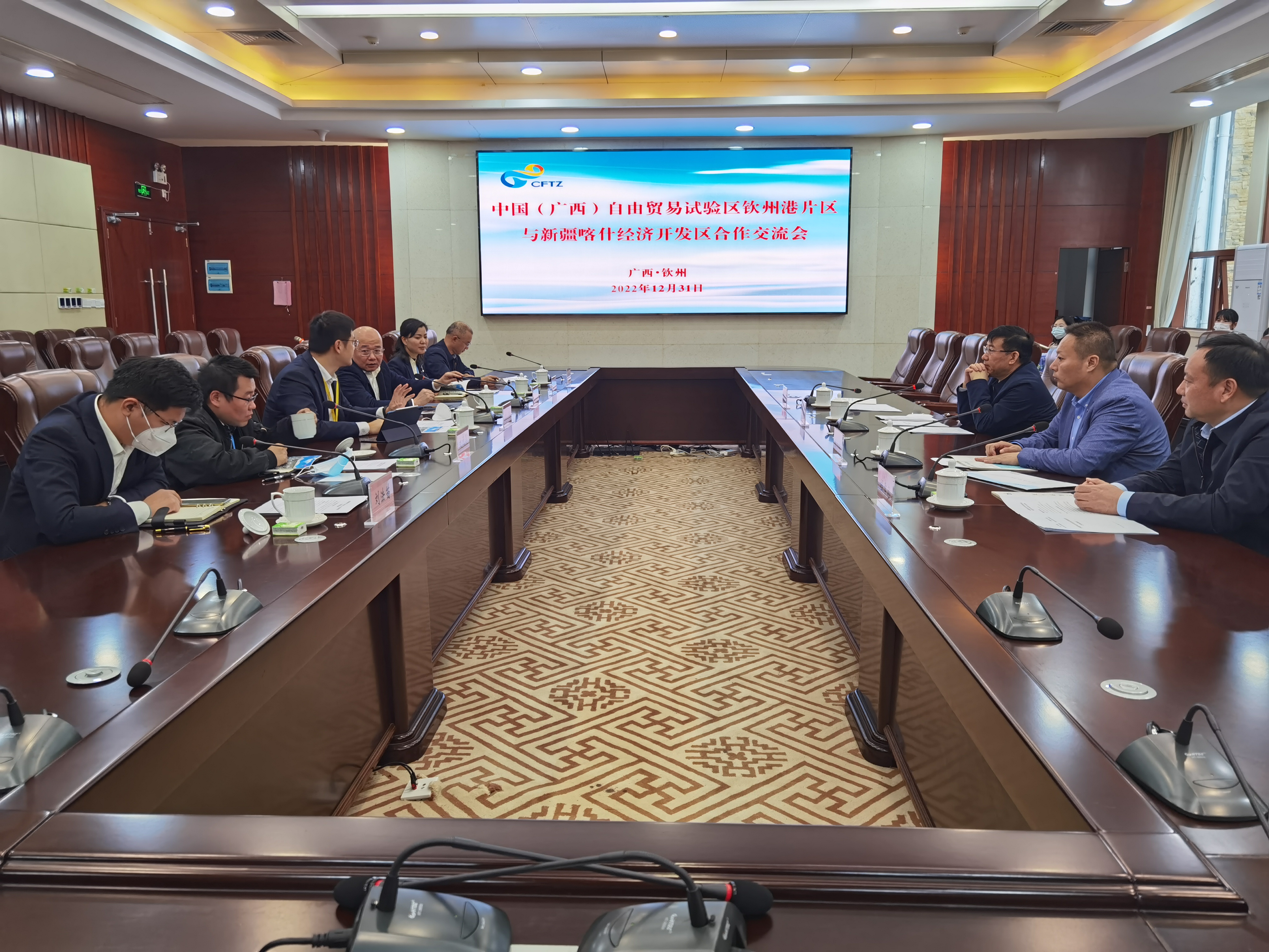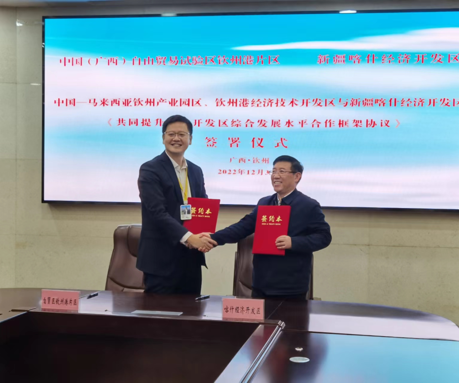 喀什地区积极对外宣传推介,利用今冬明春喀什地区招商小分队赴内地招商的契机,经过前期多方联系对接洽谈,喀什经济开发区与中国(广西)自由贸易实验区钦州港片区管理委员会达成了合作共识,2022年12月31日签定战略合作协议,喀什地区行政公署党组成员、喀什经济开发区党工委书记曲连东、中国(广西)自由贸易实验区钦州港片区管理委员会副主任刘祥、喀什经济开发区城东金融贸易区管理服务中心主任王小宁、喀什经济开发区招商局副局长刘国、喀什经济开发区综合保税区管理委员会副主任程孝忠出席签约仪式。此次签约,将进一步加强开发区之间的交流与合作,促进双方进一步经济发展,实现合作共赢。