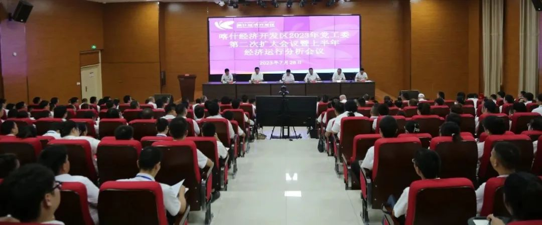 7月28日上午,喀什经济开发区召开2023年党工委第二次扩大会议暨上半年经济运行分析会议。会议坚持以习近平新时代中国特色社会主义思想为指导,全面贯彻落实党的二十大、二十届二中全会精神,贯彻落实习近平总书记视察新疆重要讲话重要指示精神,完整准确全面贯彻新时代党的治疆方略,按照自治区党委十届八次全会和喀什地委扩大会议精神,回顾总结2023年上半年工作,系统谋划、全面部署下半年各项工作,全力确保年初既定目标任务圆满完成,奋力谱写喀什经济开发区高质量发展和高水平开放新篇章。