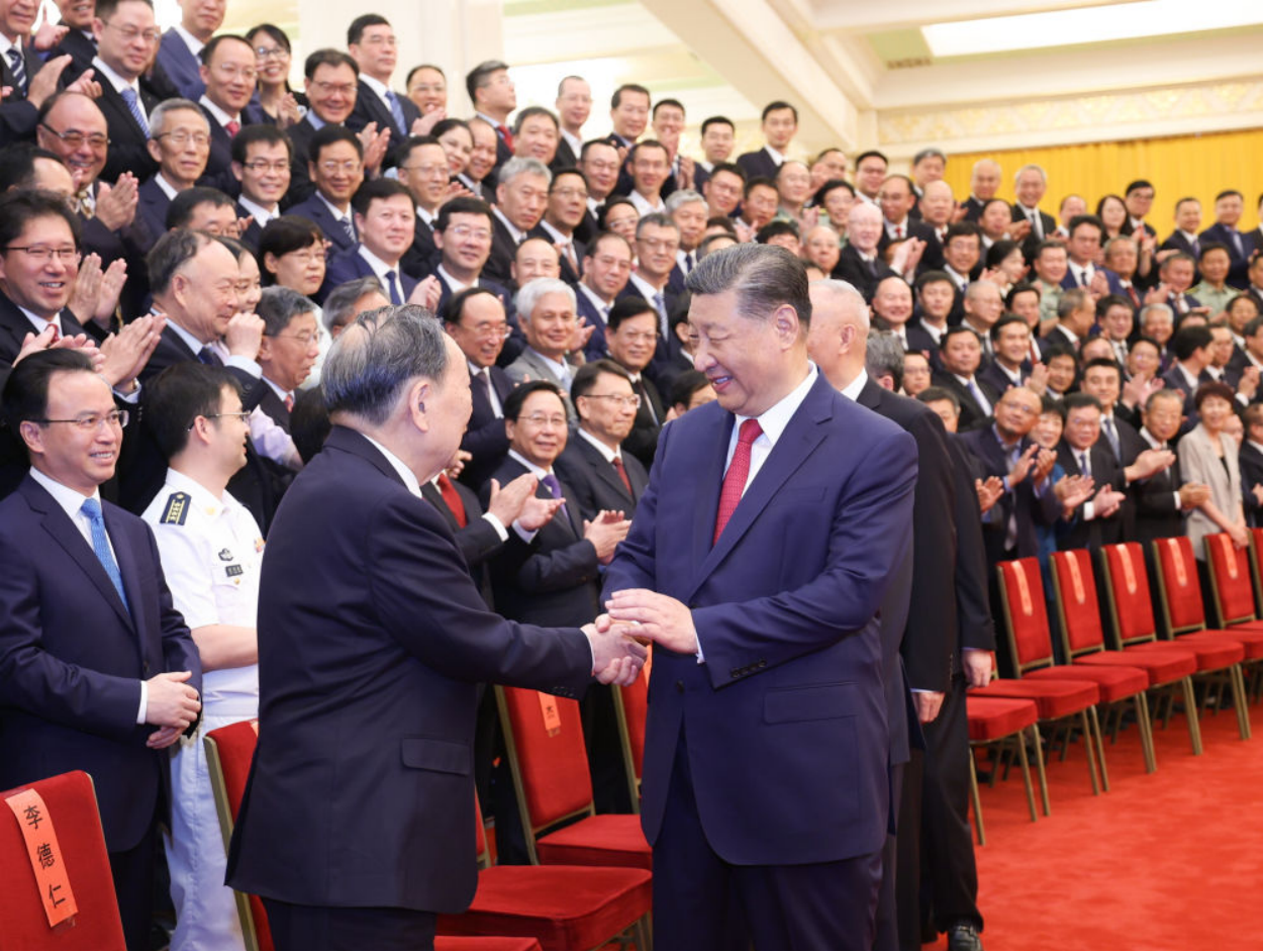 6月24日,全国科技大会、国家科学技术奖励大会和中国科学院第二十一次院士大会、中国工程院第十七次院士大会在北京人民大会堂隆重召开。会前,习近平等领导同志亲切会见国家科学技术奖获奖代表。这是习近平同志获得2023年度国家最高科学技术奖的清华大学薛其坤院士亲切交流。新华社记者 鞠鹏 摄