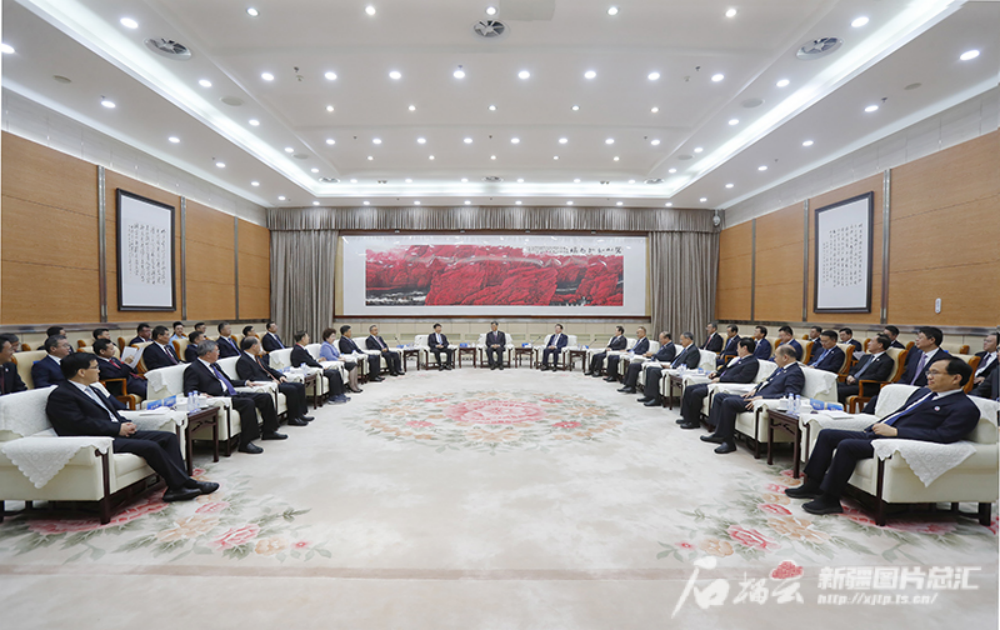 开幕式前,马兴瑞、艾尔肯·吐尼亚孜会见来新疆出席博览会的国家部委、各省区市和香港特别行政区及中央企业等方面的嘉宾。石榴云/新疆日报记者 谢龙摄