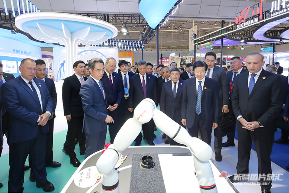 开幕式前,马兴瑞、高云龙、艾尔肯·吐尼亚孜同阿·扎帕罗夫、阿里波夫、霍利克佐达、茹曼加林、托罗巴耶夫等中外嘉宾巡馆。石榴云/新疆日报记者 谢龙摄
