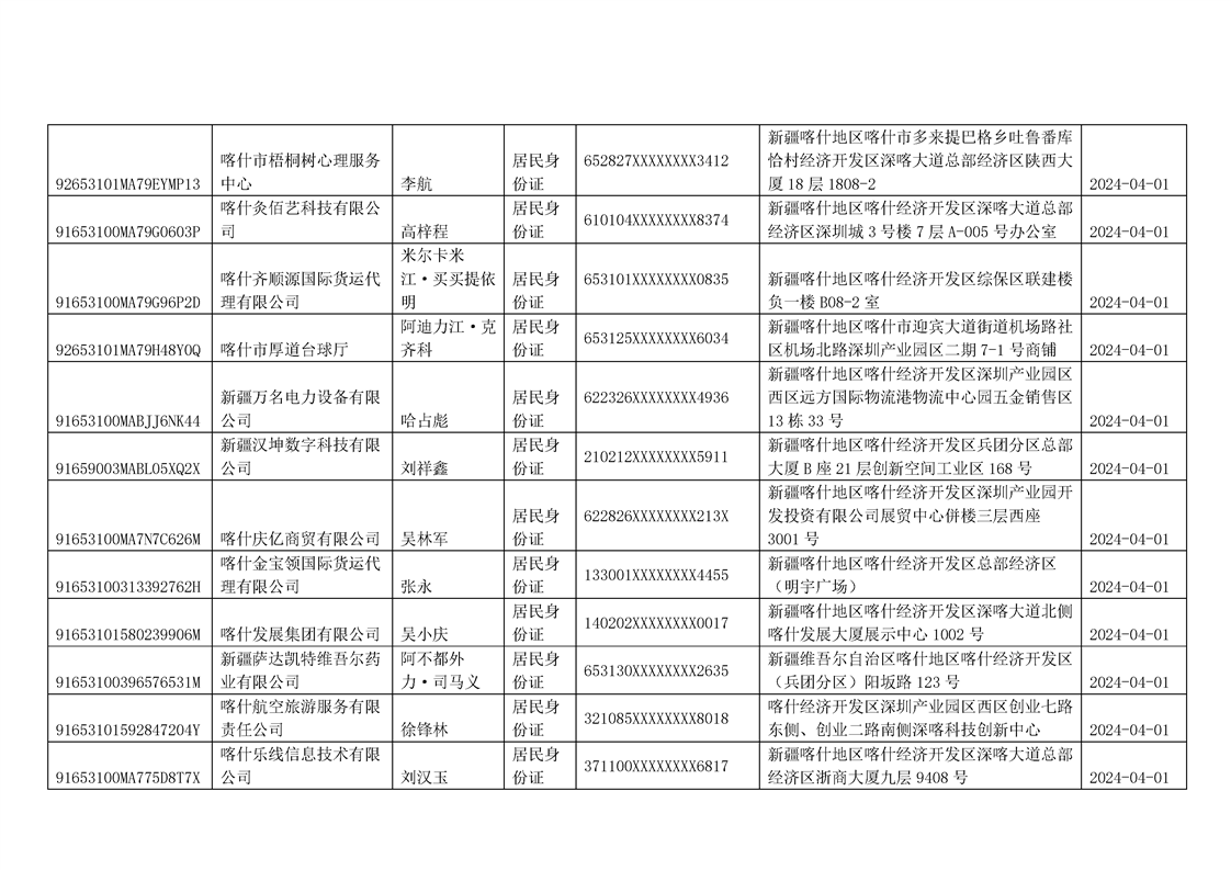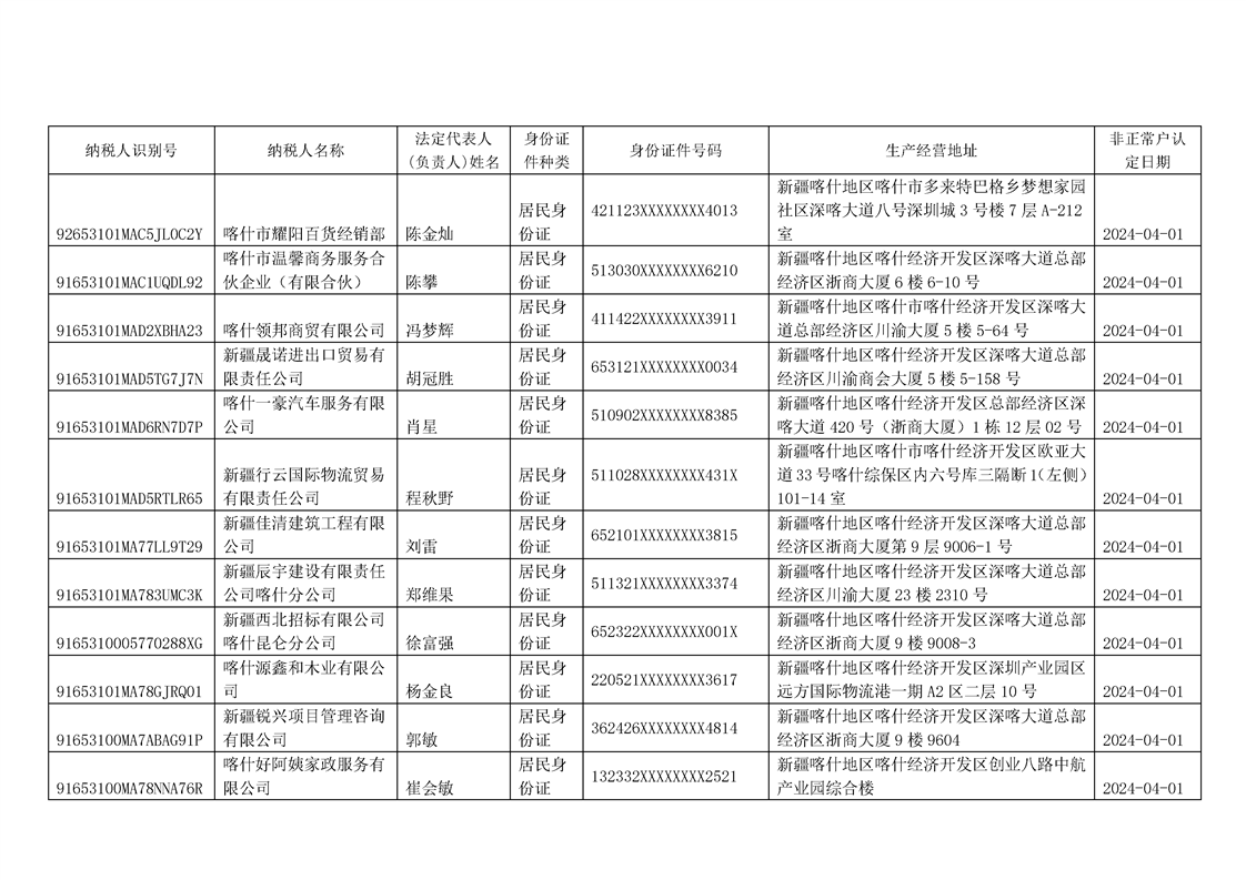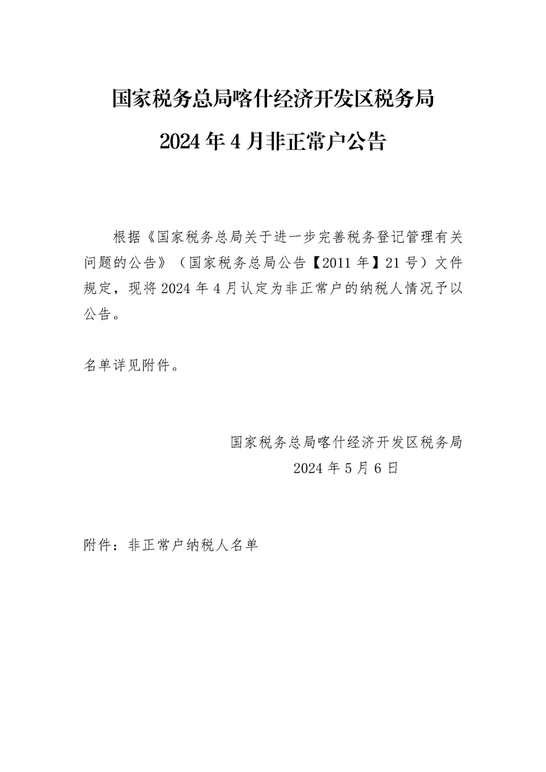 国家税务总局喀什经济开发区税务局2024年4月非正常户公告